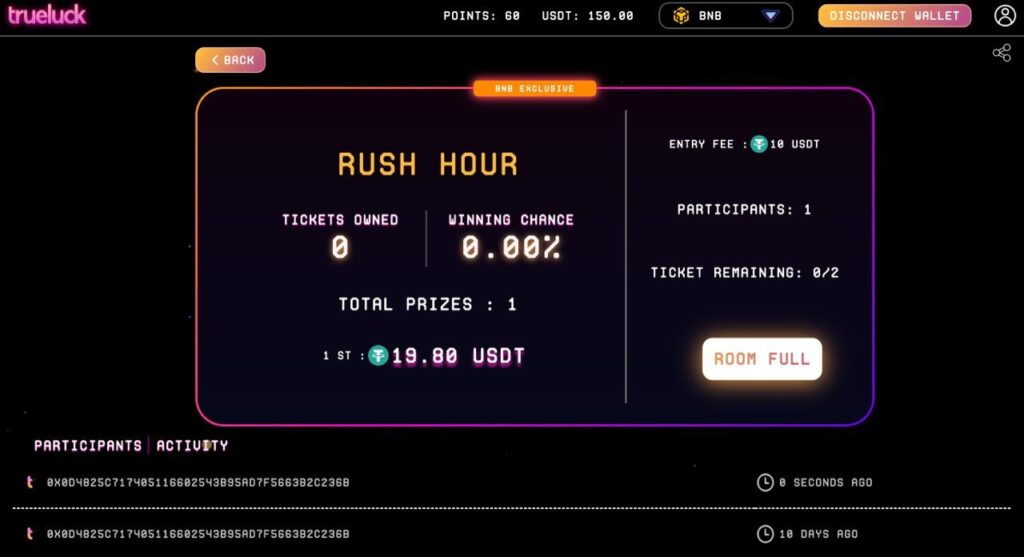 Once connected, users can browse the active raffle rooms. Each room is completely transparent and clearly displays: